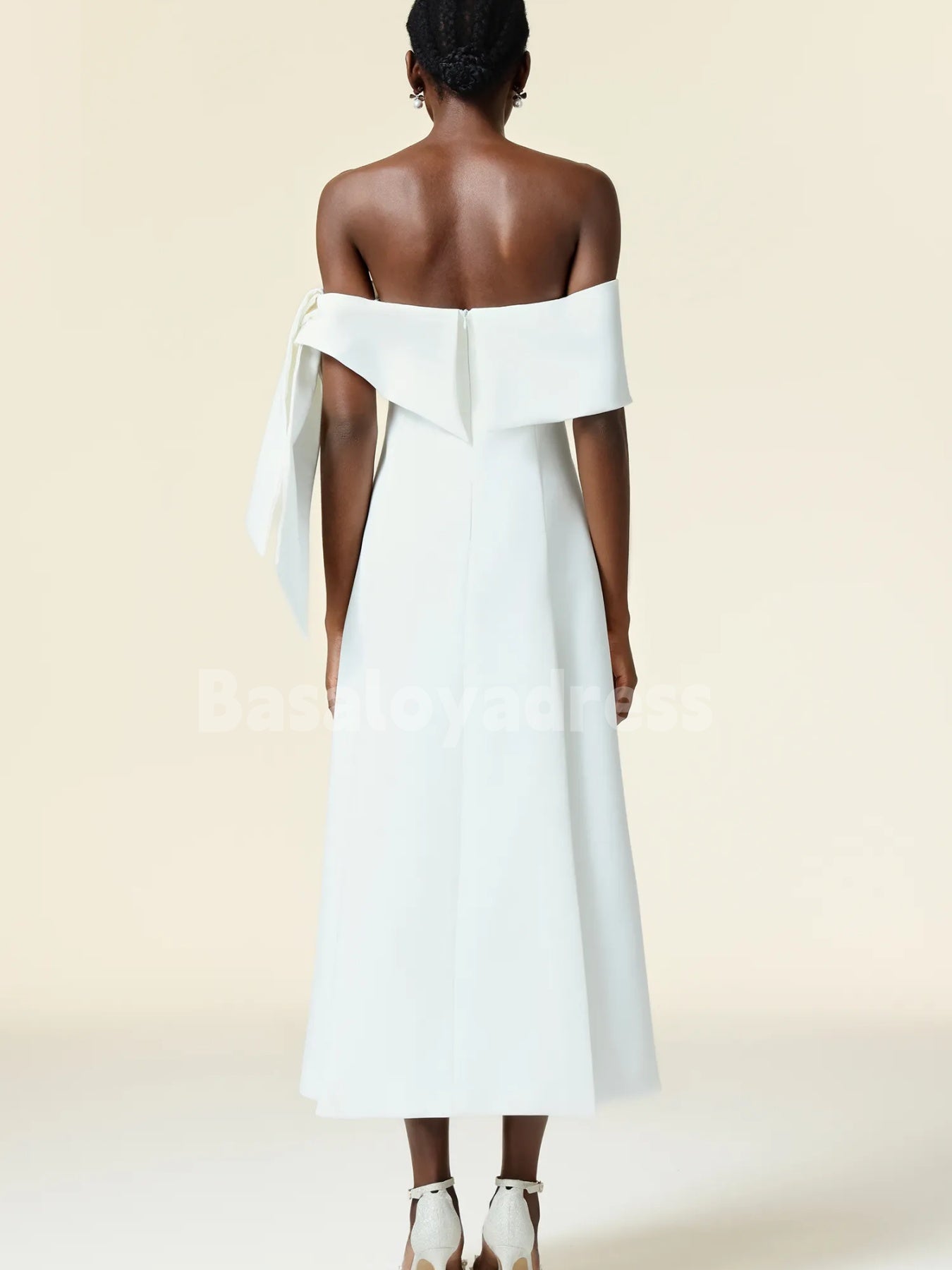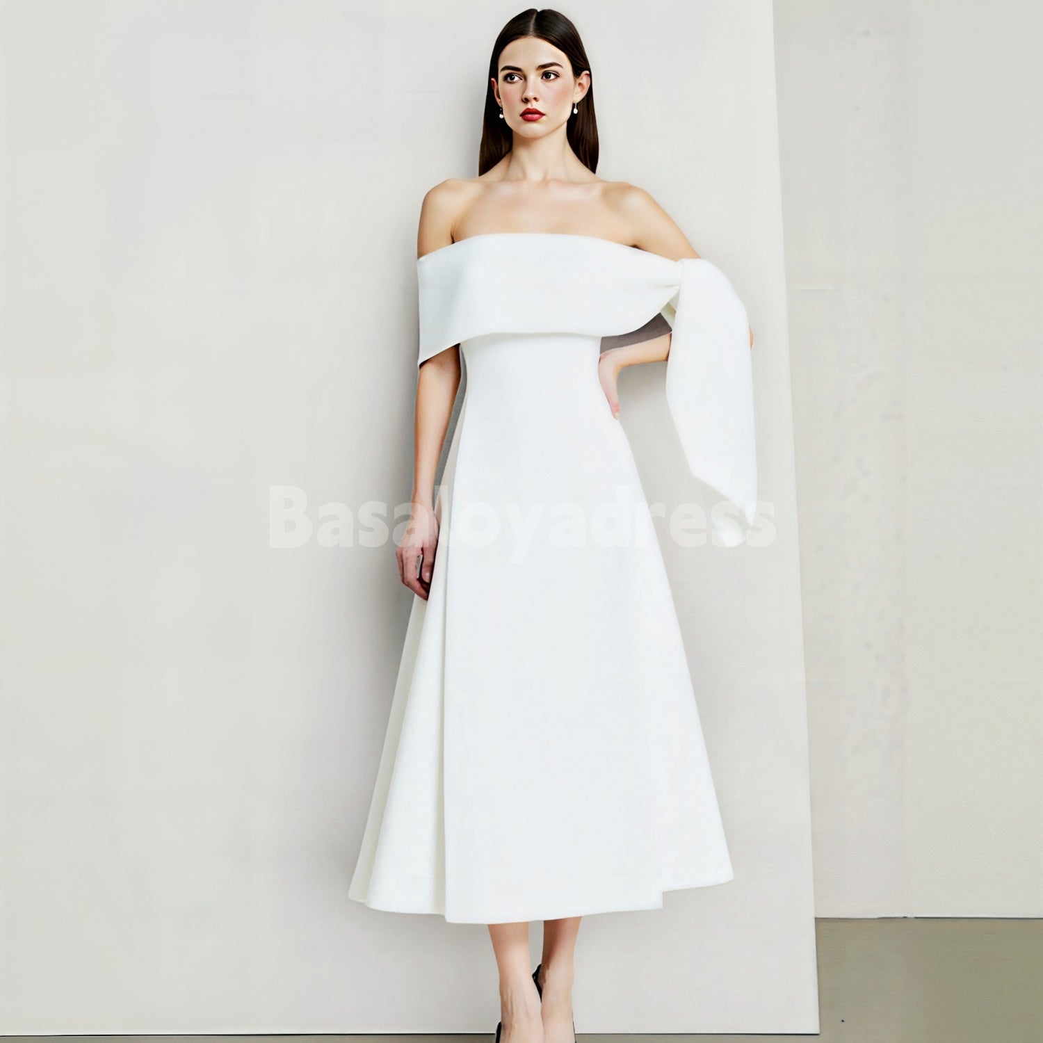 BDES00076 White Designed A-line Off-The-Shoulder Sleeveless Asymmetric Satin Maxi Dress
