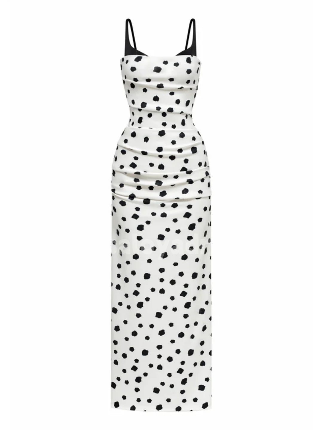 This Black Spaghetti Strap Midi Dress features an irregular polka dot print for a contemporary twist on a classic pattern. Designed with ruched detailing and a draped silhouette, it enhances natural curves while offering a flattering fit. The bodycon cut combines elegance with comfort, making it ideal for both day and evening wear. Lightweight and breathable, this dress pairs effortlessly with various accessories for versatile styling.