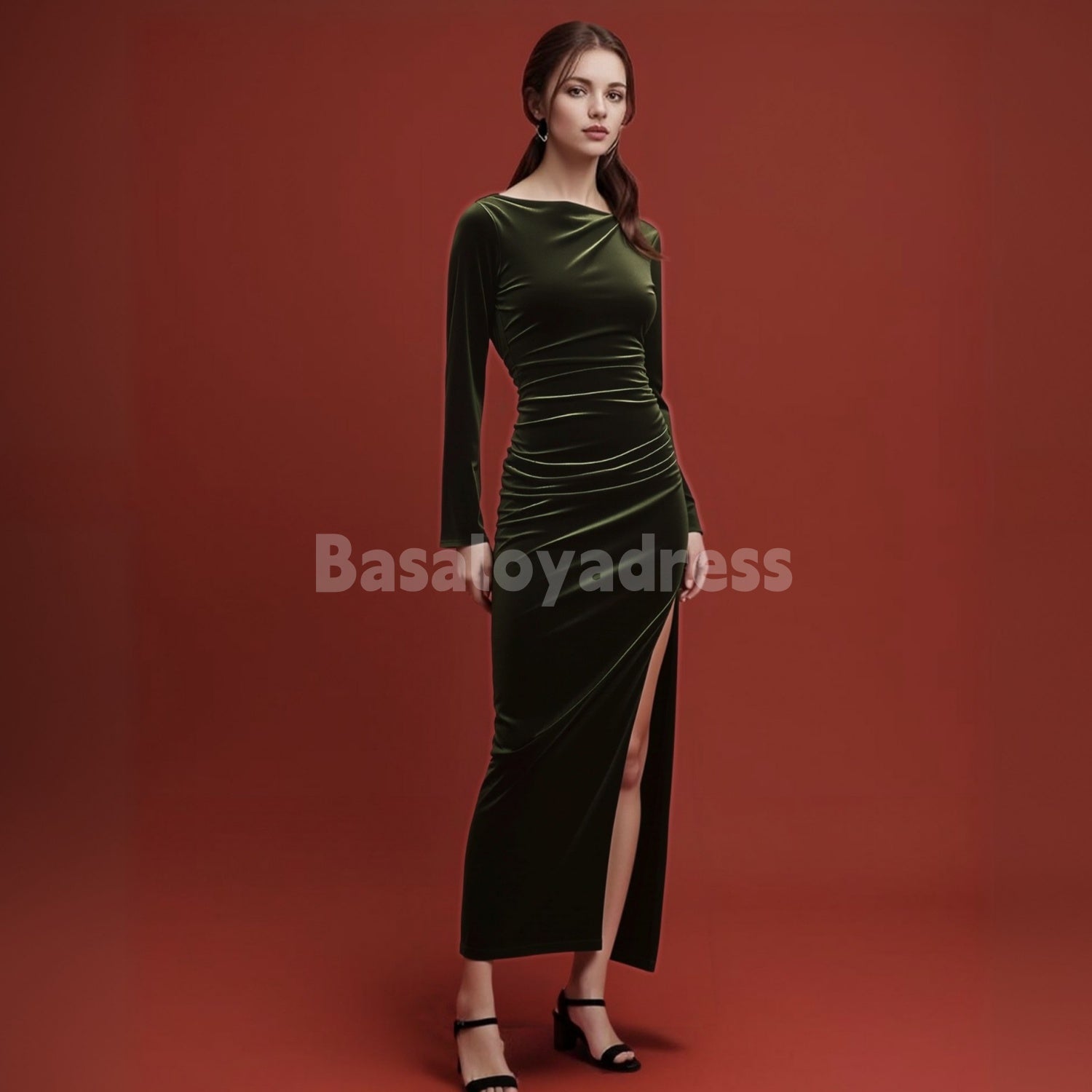 This Boat Neck Long Sleeve Stretch Velvet Maxi Dress features luxurious velvet fabric with a comfortable stretch for an elegant fit. The boat neckline and long sleeves provide refined coverage, while the daring side split adds a touch of allure. Ideal for evening events, it balances sophistication and modern style effortlessly.