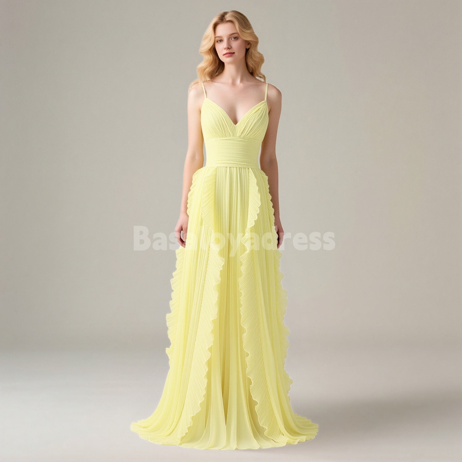 BDES00125 A Line Spaghetti Straps Chiffon Pleated Bridesmaid Dress Prom Dresses with Ruffles