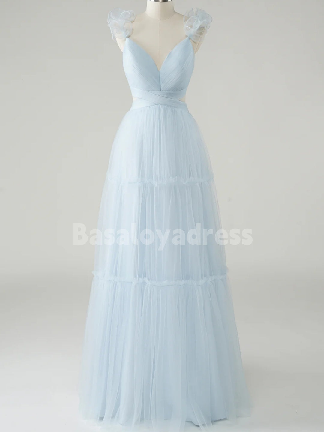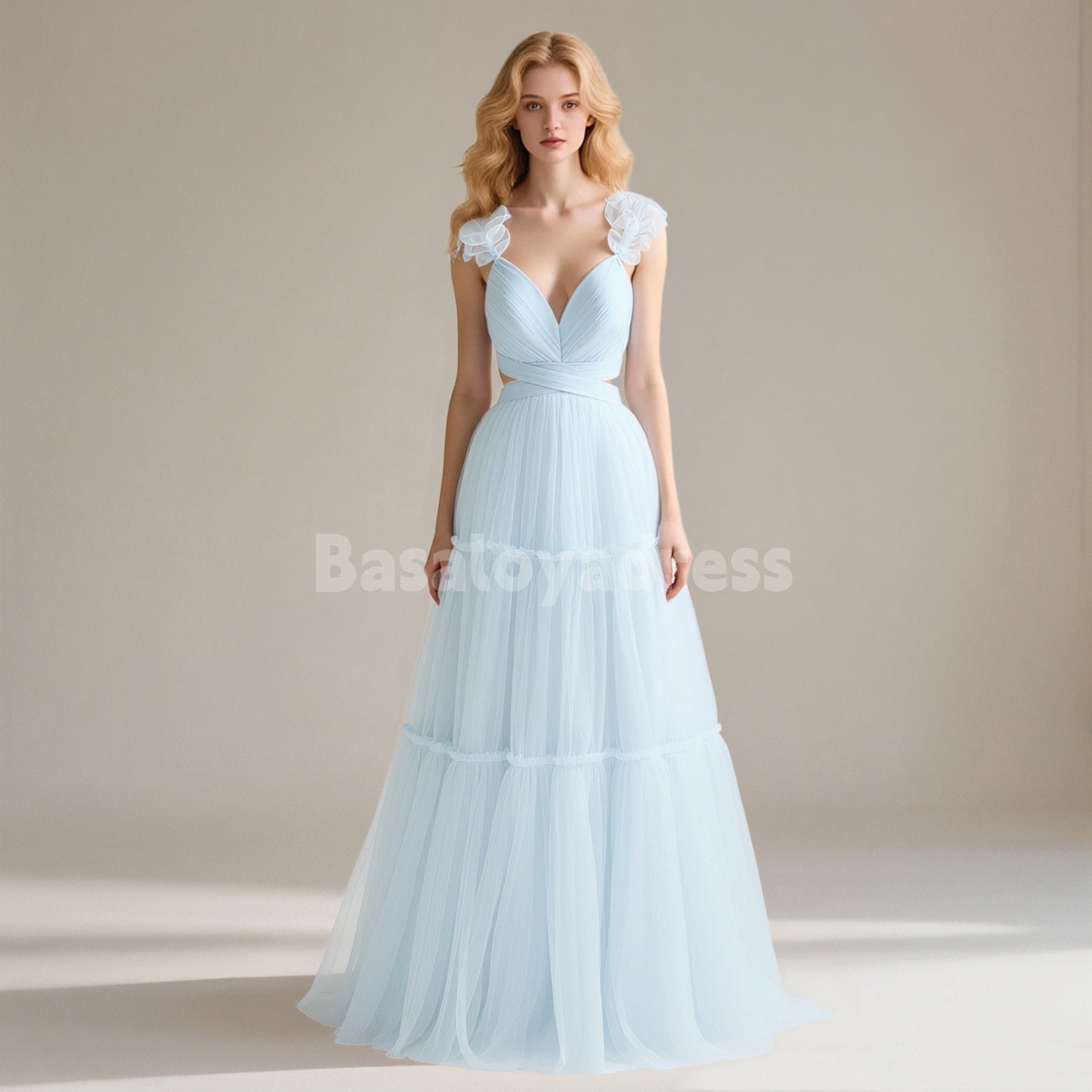 BDES00133 Sky Blue A-Line Ruffles Straps Tulle Prom Dress V-Neck Sleeveless Bridesmaid Dresses