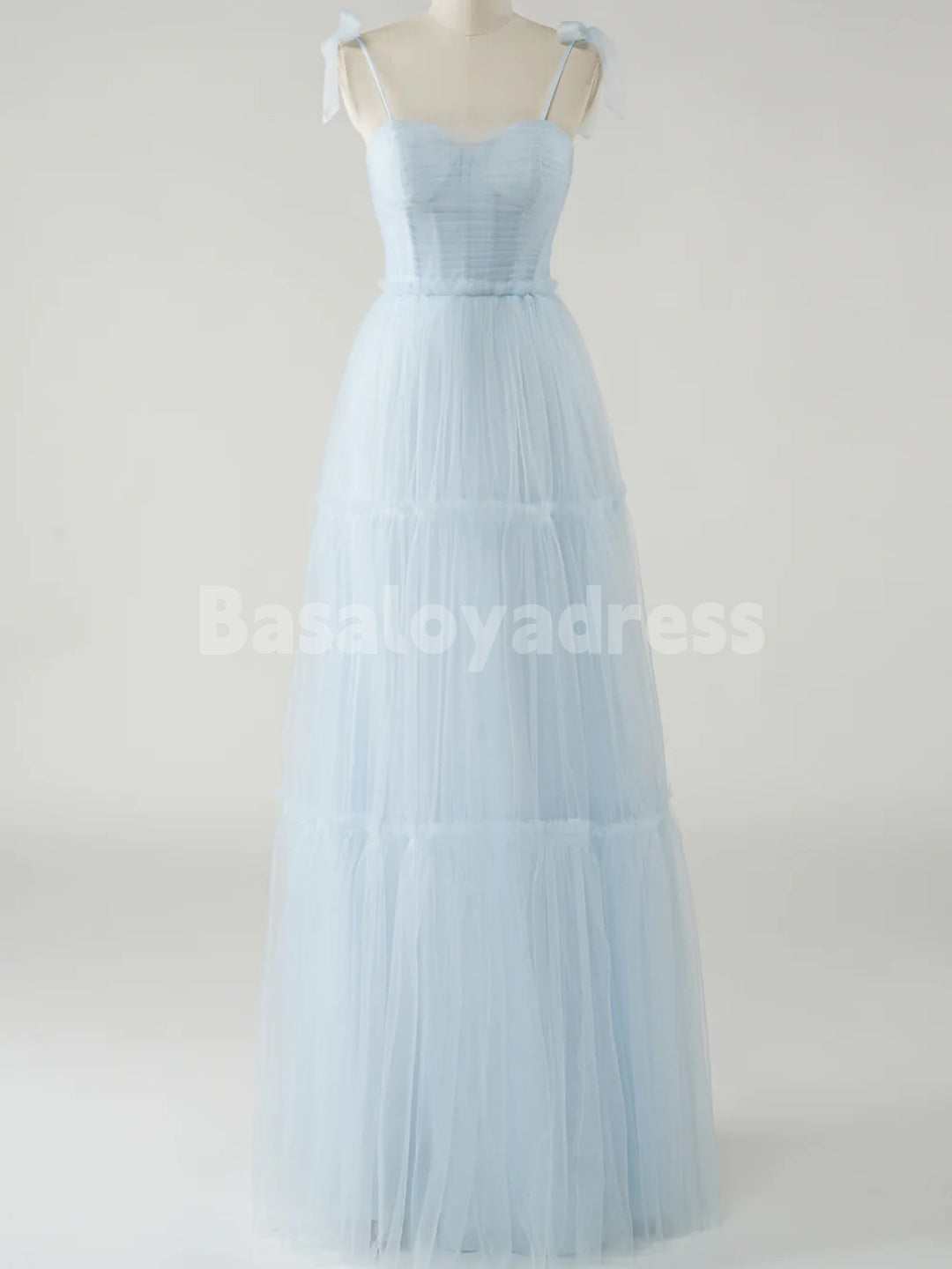 BDES00134 Sky Blue A-Line Bow Tie Straps Tulle Prom Dress Sleeveless Bridesmaid Dresses