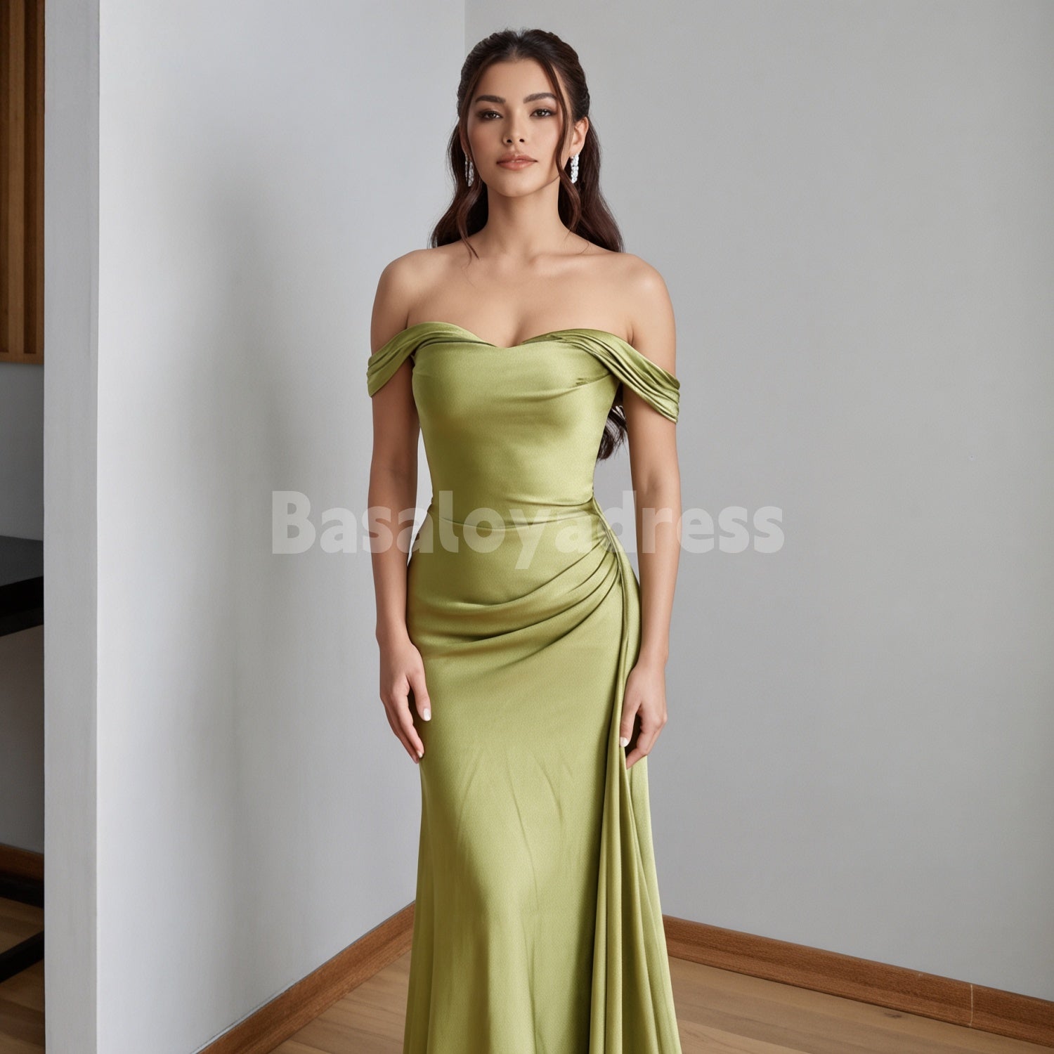 BDES00139 Olive Off-the-shoulder Mermaid Satin Neck Ruched Maxi Dress