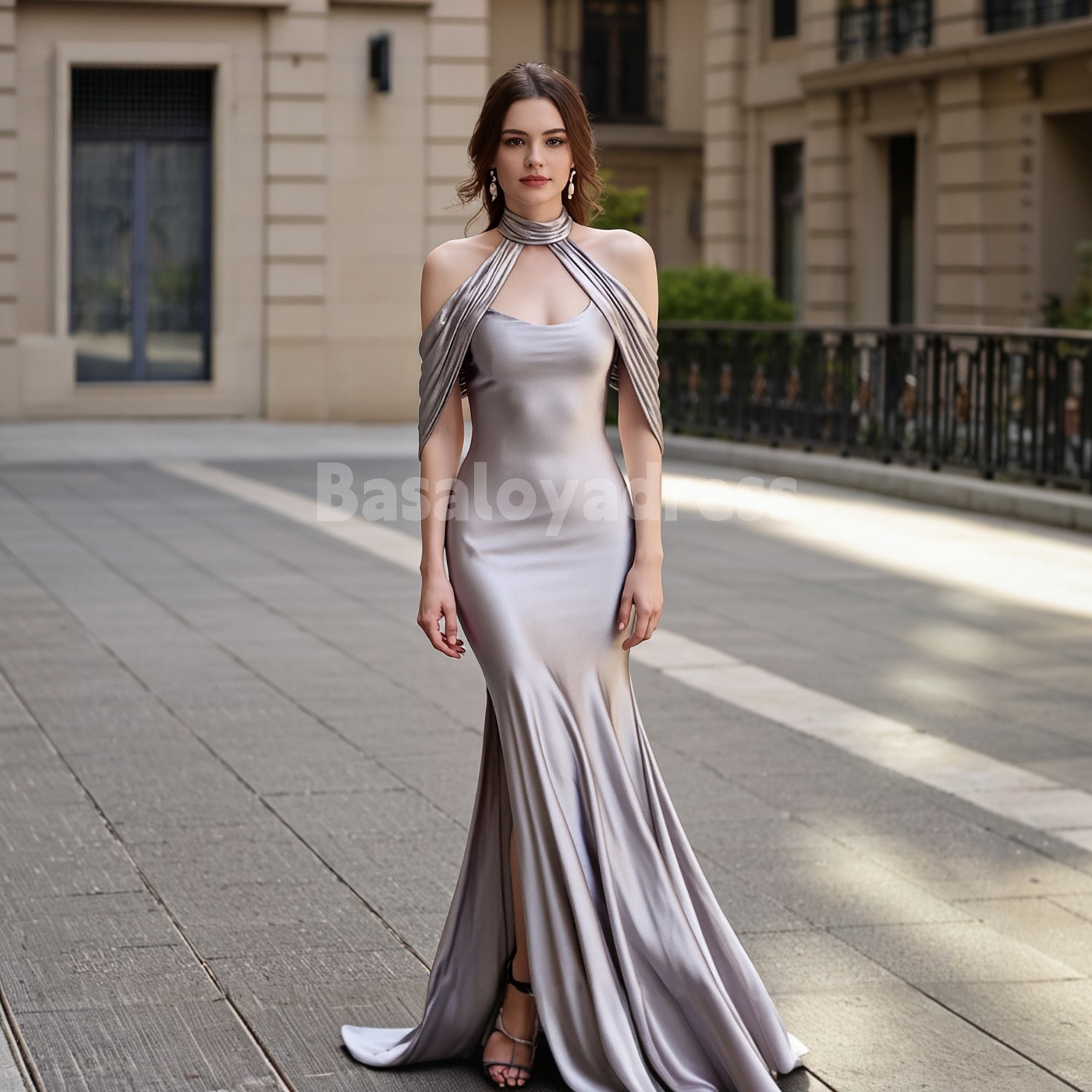 Elevate your formal look with this Silver Gray Off Shoulder Halter Evening Dress, featuring a sophisticated mermaid silhouette and a daring side split. The off-shoulder halter design adds a refined touch while highlighting your neckline and shoulders. Perfect for weddings and upscale parties, this dress combines elegance and allure to ensure you stand out with confidence and grace.