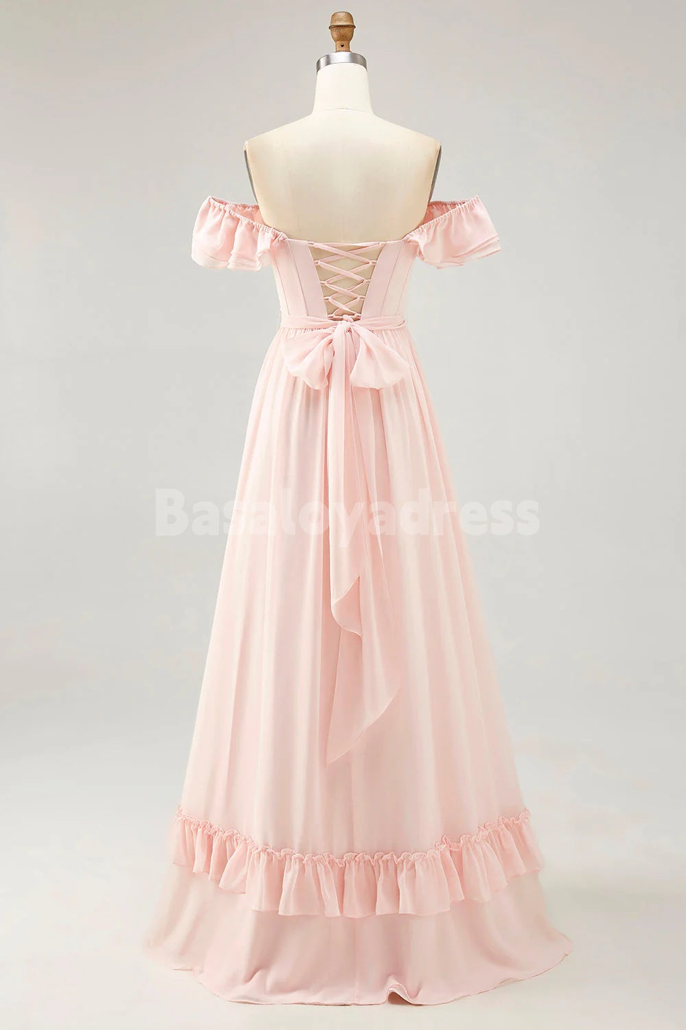 This elegant bridesmaid dress combines romantic sophistication with contemporary design. The off-shoulder neckline creates a graceful, flattering silhouette, while the A-line cut provides comfortable movement and a universally flattering shape. Delicate 3D floral embellishments add dimensional texture and visual interest, elevating the dress beyond standard bridesmaid wear. Ruffled detailing enhances the feminine aesthetic, and the subtle slit offers practical ease without compromising elegance. The soft pink hue complements a variety of skin tones and coordinates seamlessly with diverse wedding color palettes. Perfect for bridesmaids seeking a dress that balances timeless charm with modern styling details.
