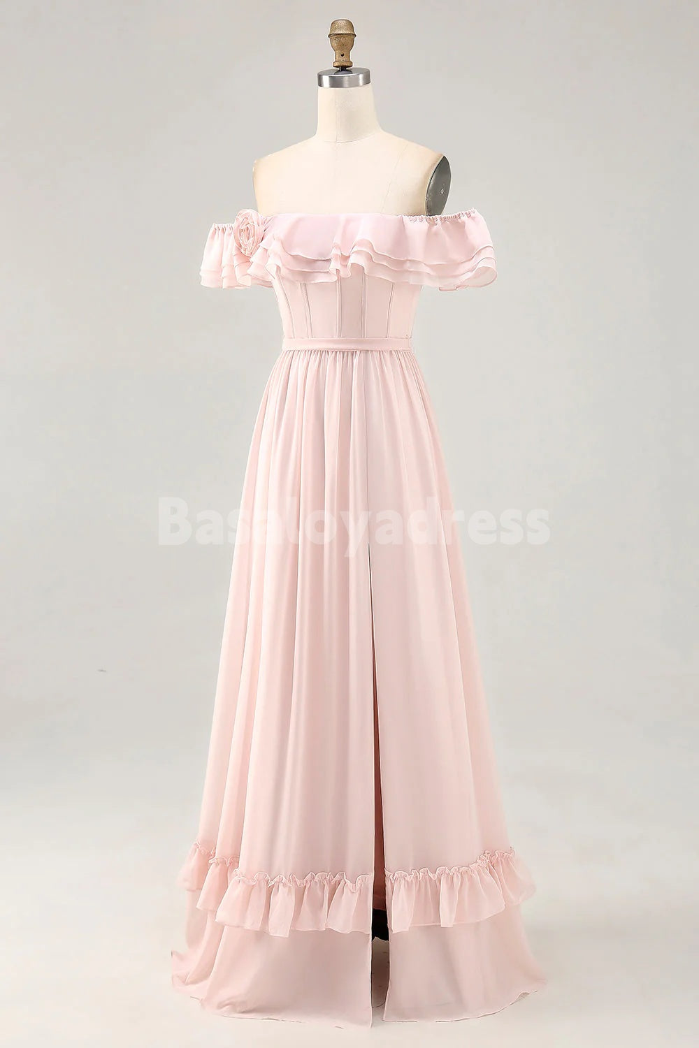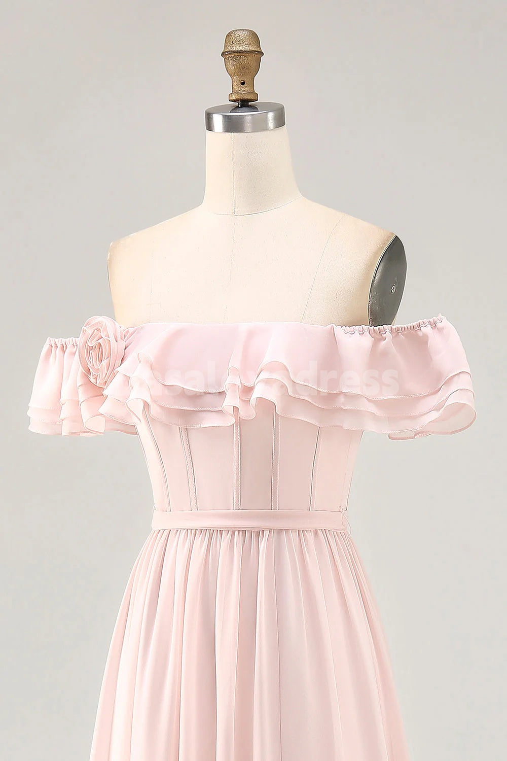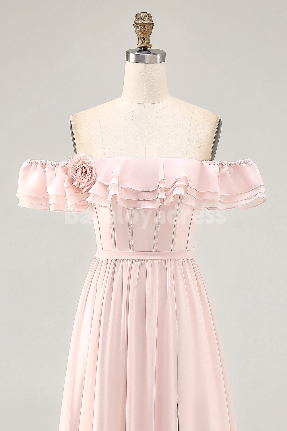 BDES00170 Pink A Line Off The Shoulder Ruffled 3D Flower Bridesmaid Dress with Slit