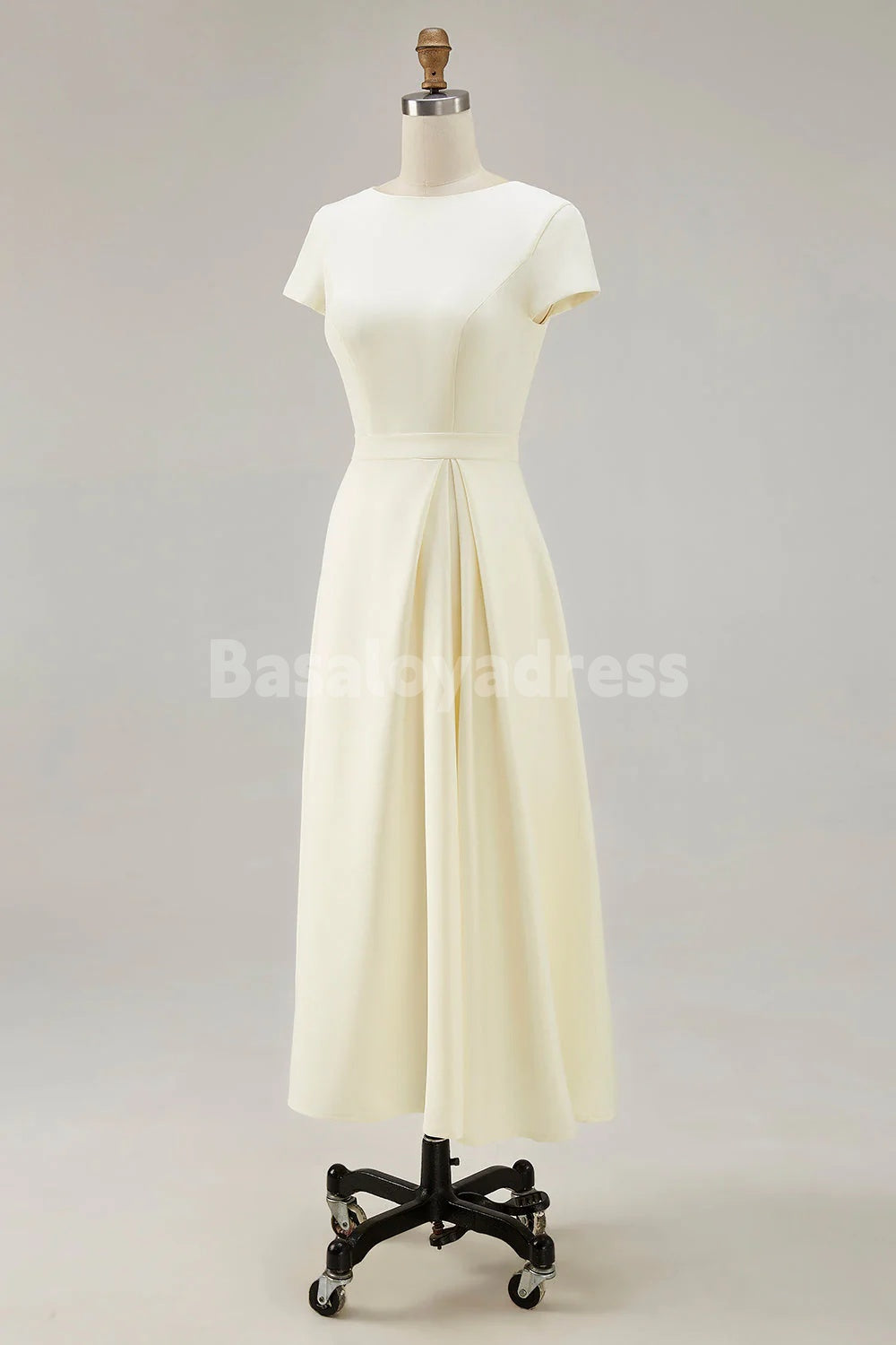 BDES00173 Light Yellow A Line Boat Neck Vintage Satin Short Sleeves Midi Work Dress