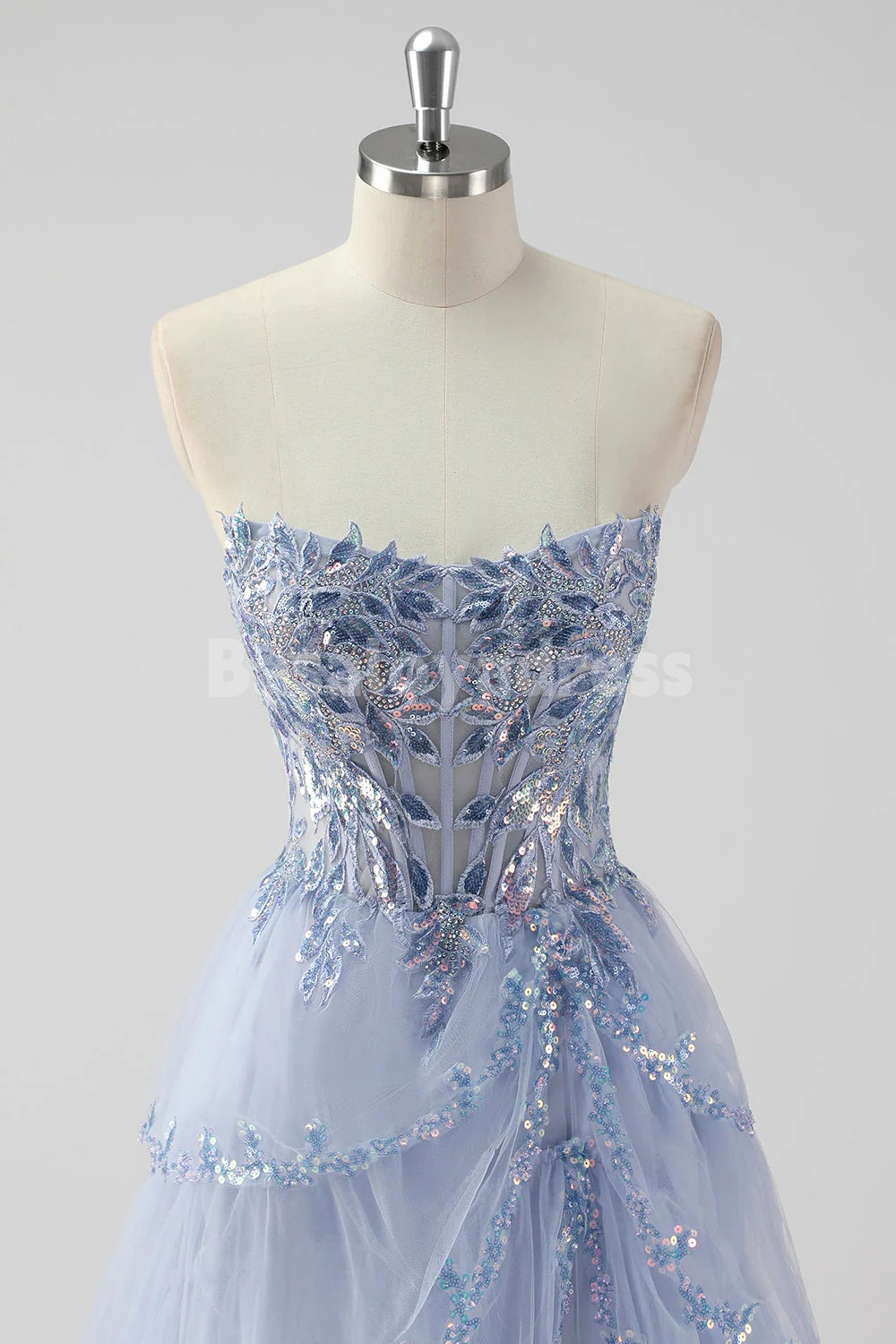 BDES00174 Lavender A Line Detachable Spaghetti Strap Sequins Corset Tiered Prom Dress with Slit