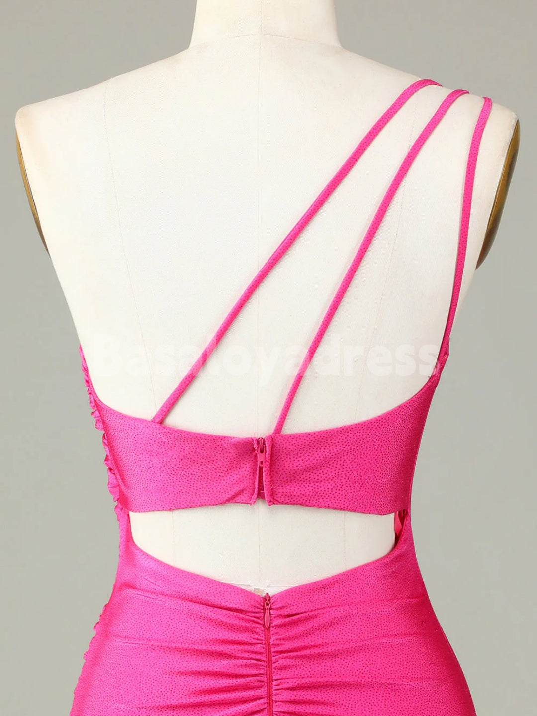 This royal blue one-shoulder bodycon dress combines modern elegance with a flattering ruched design. Featuring slender spaghetti straps and a chic back cutout, it enhances your silhouette while adding a bold statement. Perfect for homecoming or special events, this short dress balances sophistication with contemporary style.