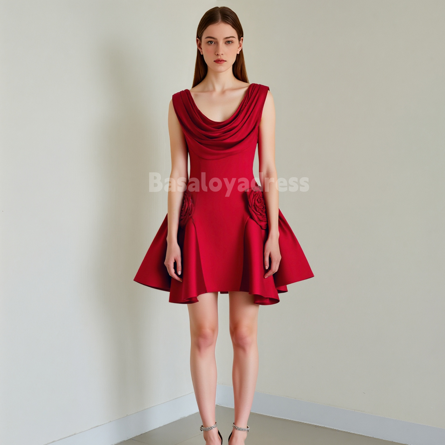 BSD00063 Solid Spliced 3D Flowers Mini Dresses Pleated Scoop Neck Sleeveless High Waist Temperament Cocktail Dress