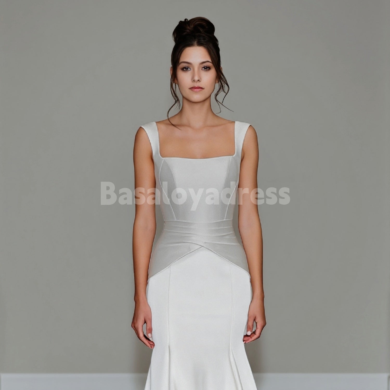 This modern 2026 wedding dress features a sleek mermaid silhouette crafted from smooth satin in elegant silver gray or light beige. Wide straps provide both comfort and support while enhancing the dress's minimalist design. The attached train adds graceful movement, making it a contemporary and refined choice for a sophisticated bridal look.