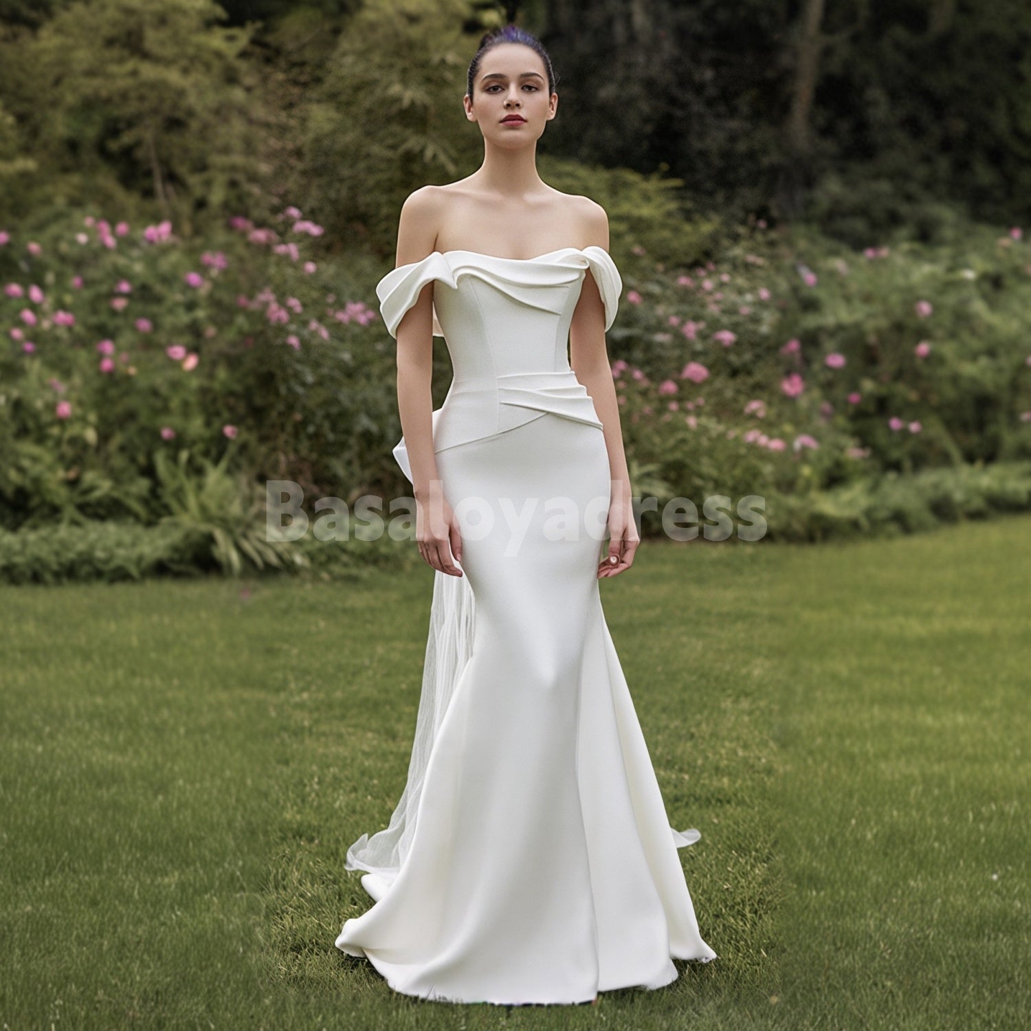 BWD00030 Off-the-shoulder Satin Pleated Mermaid Wedding Dress with Detachable Bow Train
