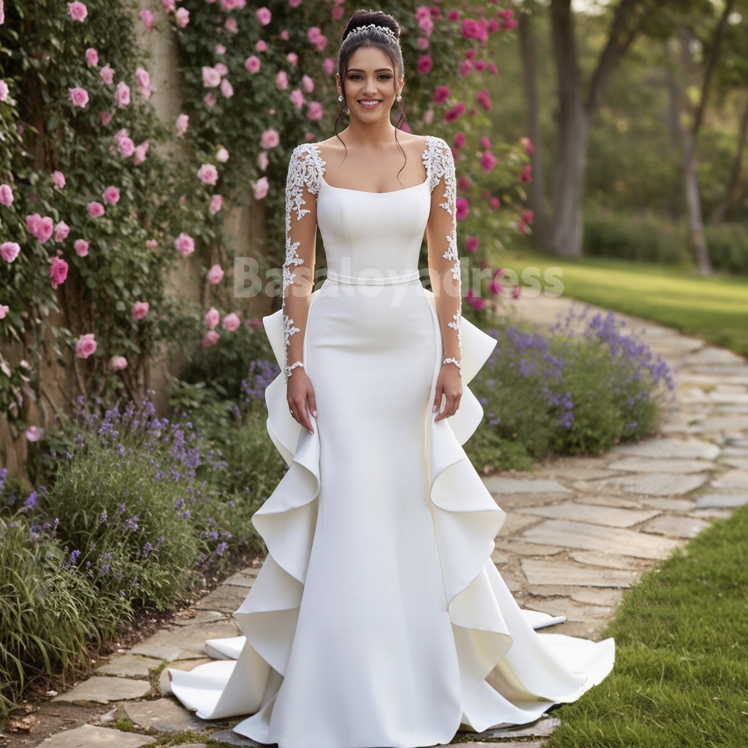 This elegant satin mermaid wedding dress features long sleeves adorned with intricate lace appliques, creating a sophisticated and timeless look. Its fitted silhouette gracefully flares into a ruffle train, adding dramatic movement and elegance for your special day. Designed to enhance your figure while providing refined details, this gown combines classic craftsmanship with modern style for an unforgettable bridal statement.