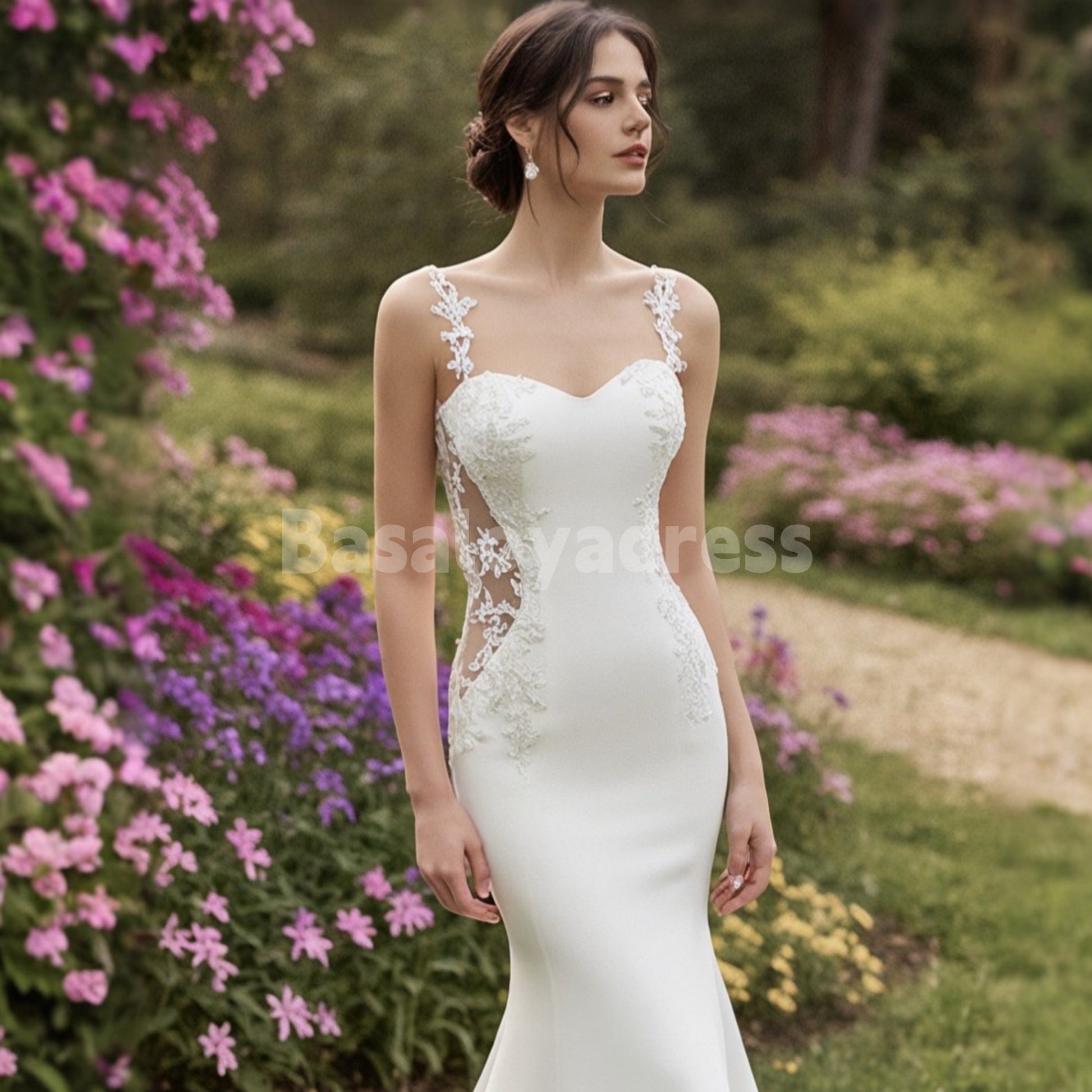 This elegant wedding gown features a flattering sweetheart neckline adorned with intricate lace appliqué, enhancing its romantic appeal. Designed with a backless silhouette, it offers a perfect blend of sophistication and allure. The mermaid cut accentuates your figure gracefully, while the lightweight fabric ensures comfort for beach and boho-style weddings. Its long, flowing design completes the look with timeless elegance, ideal for brides seeking a delicate and refined style on their special day.