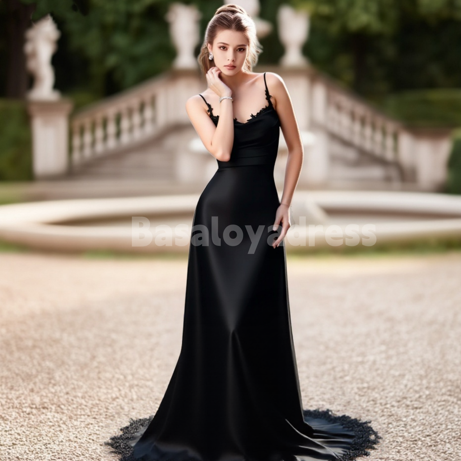 This Gothic Simple Black A-Line Wedding Dress blends sleek satin with delicate lace for a refined silhouette. The sleeveless design features slender spaghetti straps, highlighting the shoulders while offering comfortable support through its stretch fabric. Its long, flowing skirt enhances the elegant A-line shape, making it a versatile choice for those seeking a minimalist yet striking bridal look rooted in dark sophistication.