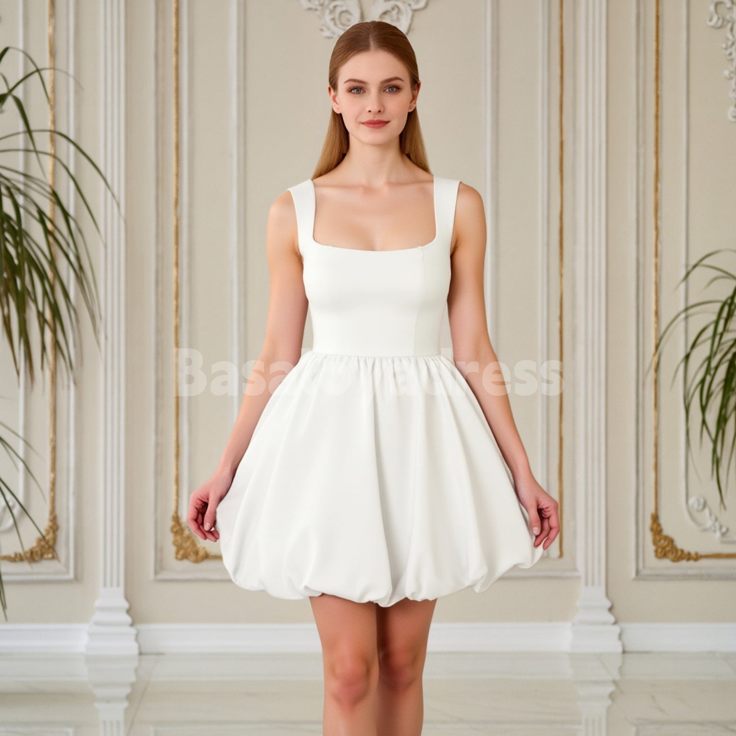 This light ivory A-line wedding dress combines elegance with practicality, featuring a smooth satin fabric and a playful bubble skirt that adds volume while maintaining a modern silhouette. The open back design offers a sophisticated, alluring touch, and discreet pockets provide convenient functionality without compromising style. Perfect for brides or homecoming events seeking a chic and comfortable look.