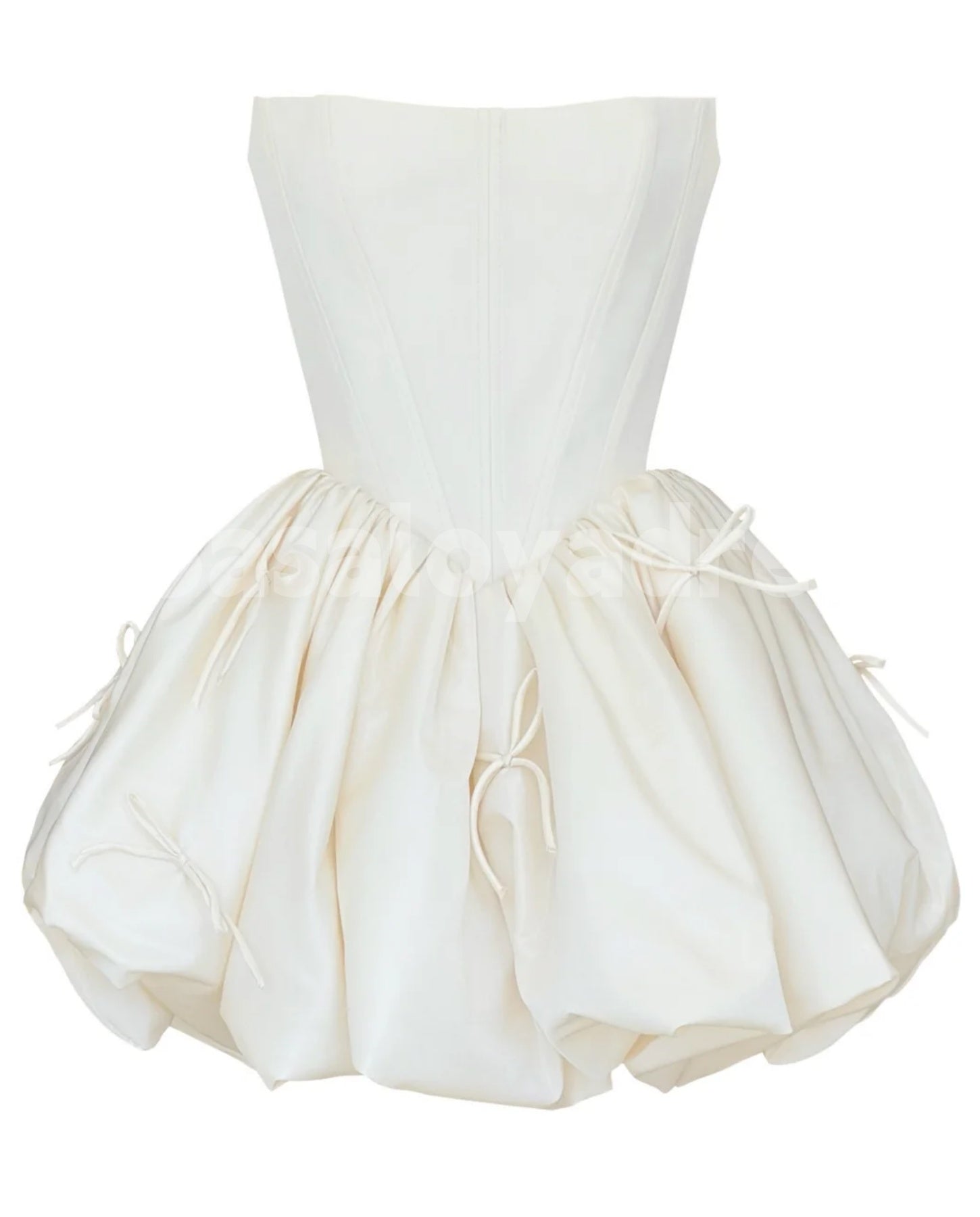This mini wedding dress combines a structured corset bodice with a playful bubble skirt, enhancing silhouette definition while offering a contemporary bridal look. Bow accents add refined detailing, and the lace-up back ensures a customizable fit for comfort and support throughout your special day. Ideal for brides seeking a blend of elegance and modern flair in a shorter gown style.